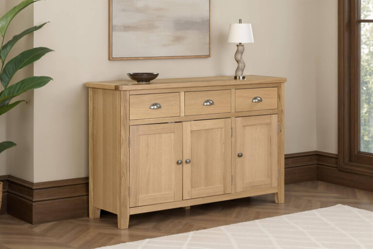 Marsden Large Sideboard in Natural Oak blends country chic style with practical functionality. Crafted with an Oak and Oak Veneer finish, it showcases the natural grain and warmth of the wood. Offering ample storage space, it includes adjustable shelves for flexible organisation and drawers set on traditional wooden runners. Finished with classic cup handles, this sideboard combines timeless charm with thoughtful design, perfect for enhancing both traditional interiors.