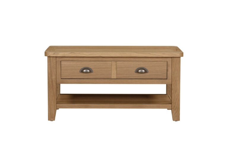 Marsden Coffee Table 900 in Natural Oak combines country chic style with smart functionality. Crafted with an Oak and Oak Veneer finish that highlights the natural beauty of the wood. A clever matchbox drawer opens from both sides with the help of traditional wooden runners and is finished with classic cup handles, offering practical and accessible storage. Its warm tones and timeless design make it a charming and versatile centre piece for any living space.
