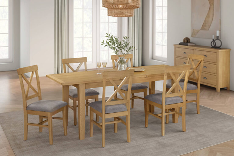 Marsden Extending Dining Table 1600/2000 in Natural Oak blends country chic charm with practical design. Crafted with an Oak and Oak Veneer finish that enhances the natural beauty of the wood. The table includes a discreet butterfly leaf extension, allowing it to expand from 1600mm to 2000mm. Ideal for accommodating extra guests. Finished with classic shaker-style legs, this piece brings timeless character and versatile functionality to any dining space.