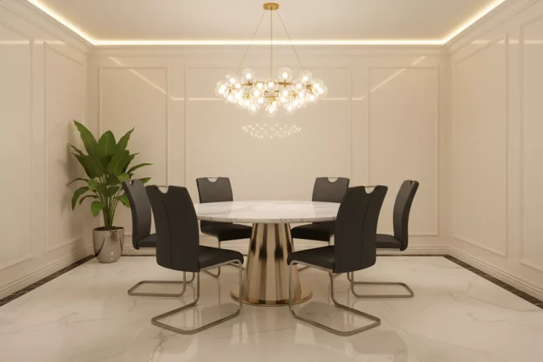 The table features a durable metal base, providing both stability and a touch of industrial charm. This sturdy foundation ensures long-lasting durability, making it a reliable choice for daily use and gatherings with family and friends.