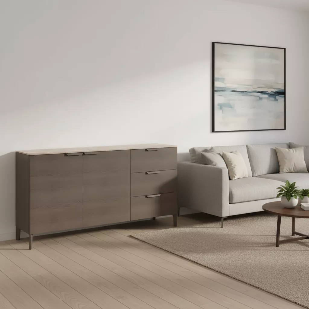 The Axton Sideboard in Latte by VIDA combines elegance with practicality. Crafted from bird wood with a dark brown walnut veneer, it exudes natural charm. Its sintered stone tabletop is heat and cold-resistant, waterproof, scratch-resistant, and stain-proof, making it easy to maintain and clean.