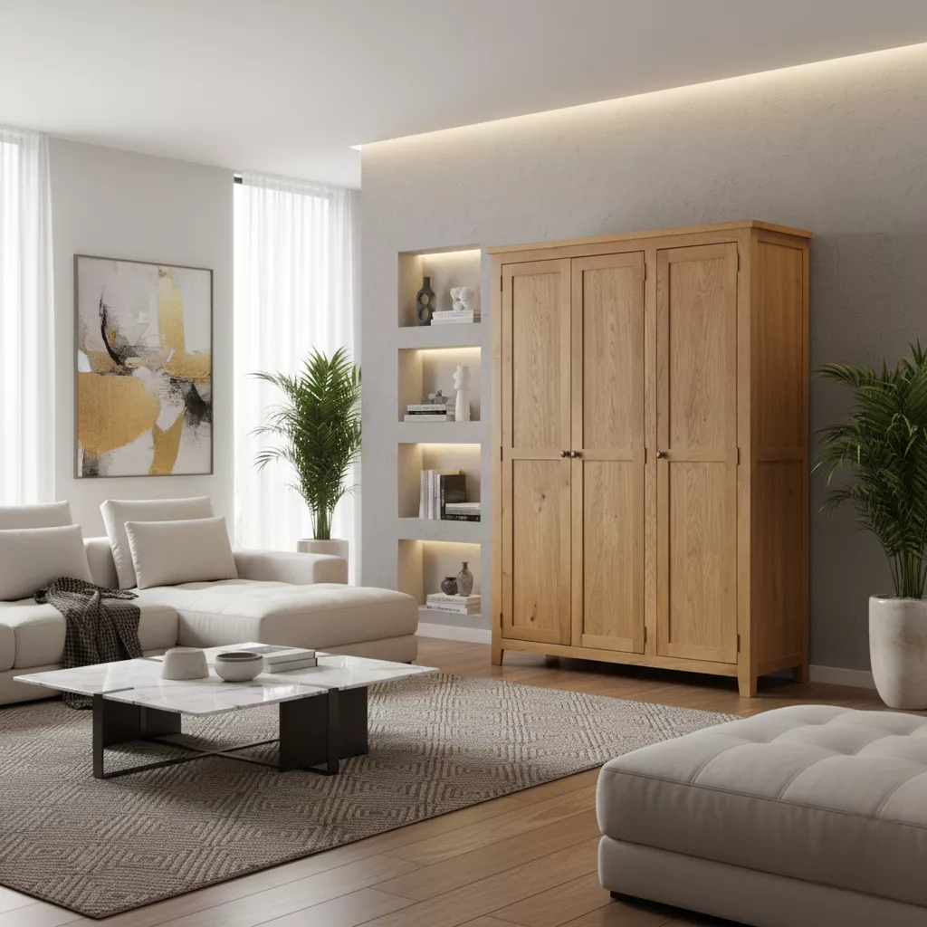 Delaney 3-Door Wardrobe in Oak. This stylish wardrobe features three doors with a long hanging rail and a versatile shelving unit. The bottom section includes three spacious drawers, each fitted with sleek metal handles. Its traditional design and warm oak finish add classic elegance to any bedroom.