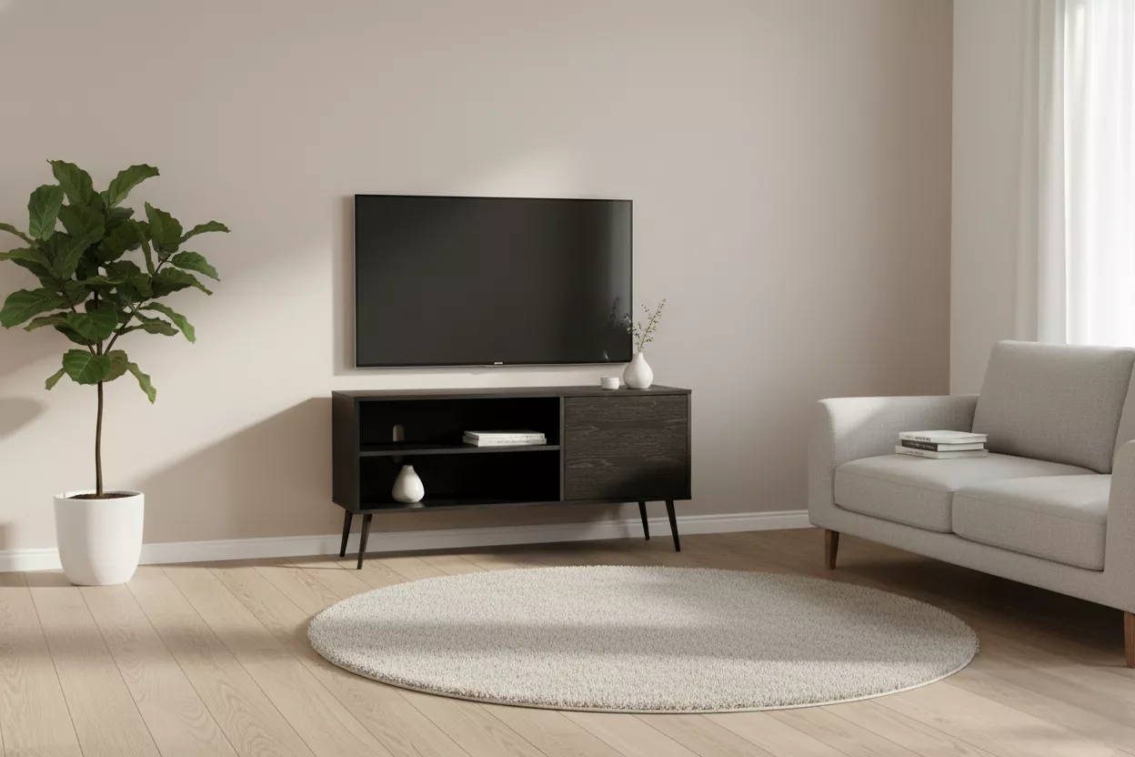 Doolin TV Unit 1000 in Black. This sleek unit combines practical function with a minimal design, offering ample storage space and an outlet for easy cable connection. Its black finish adds a modern touch, while the clean lines ensure it complements any decor.