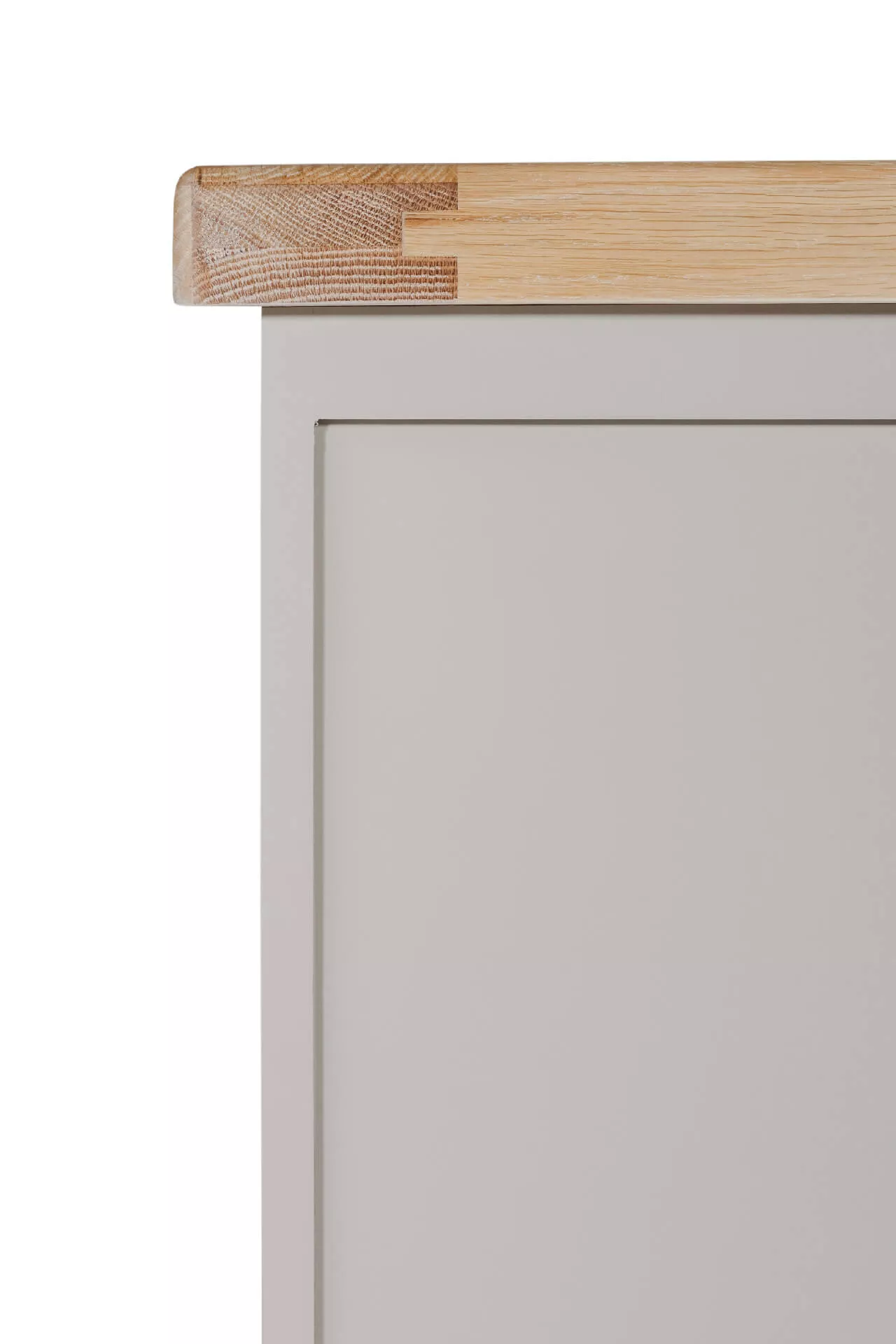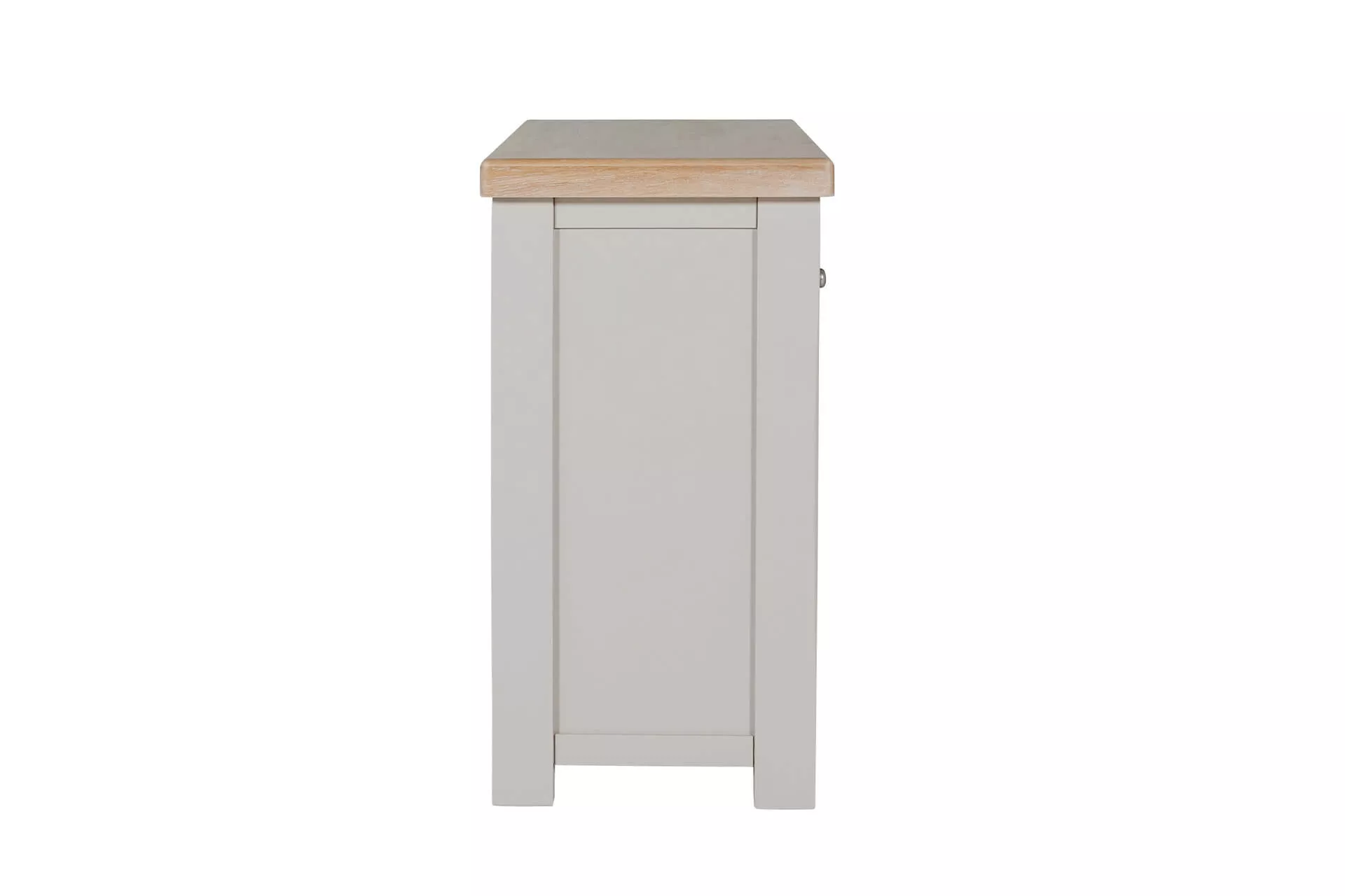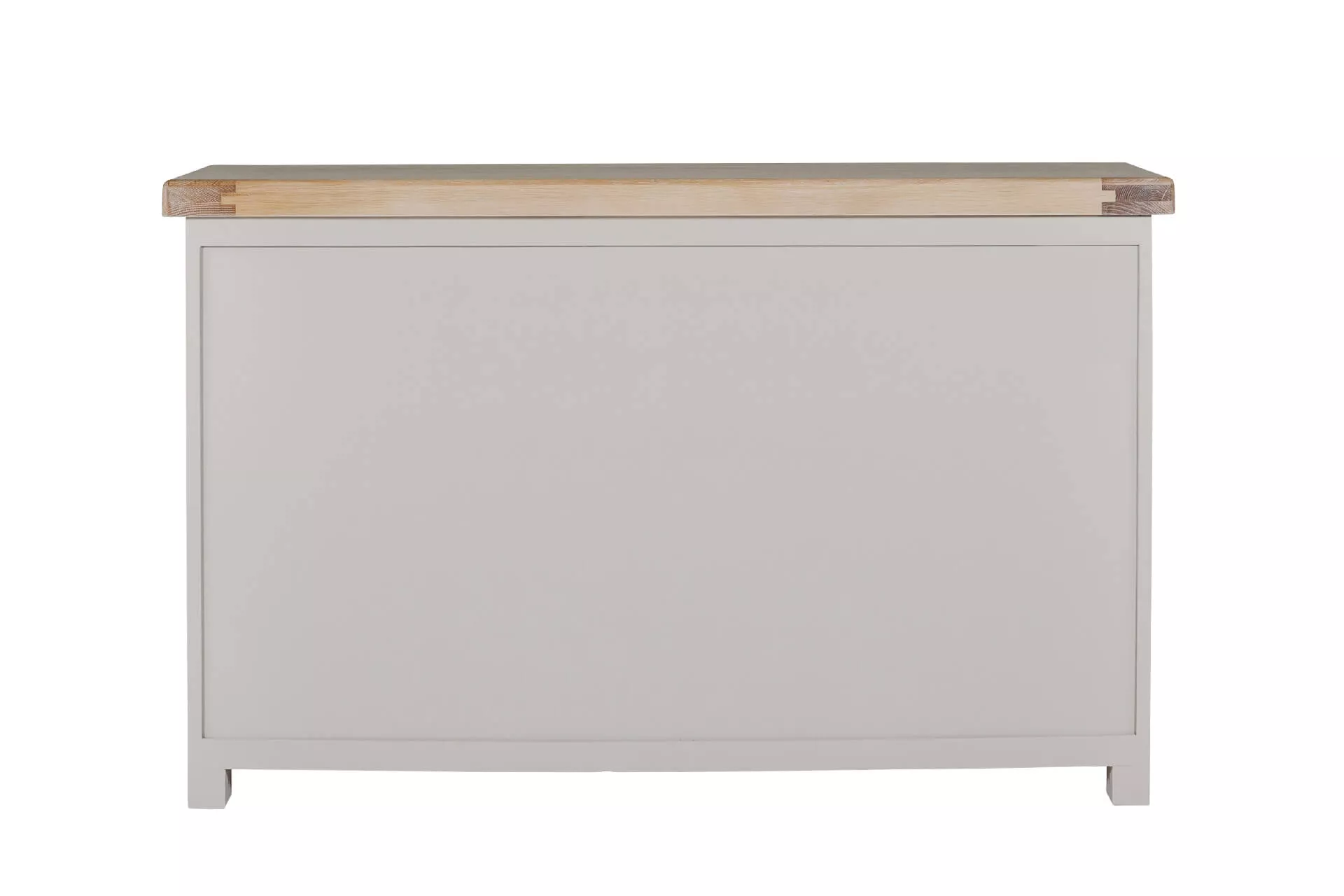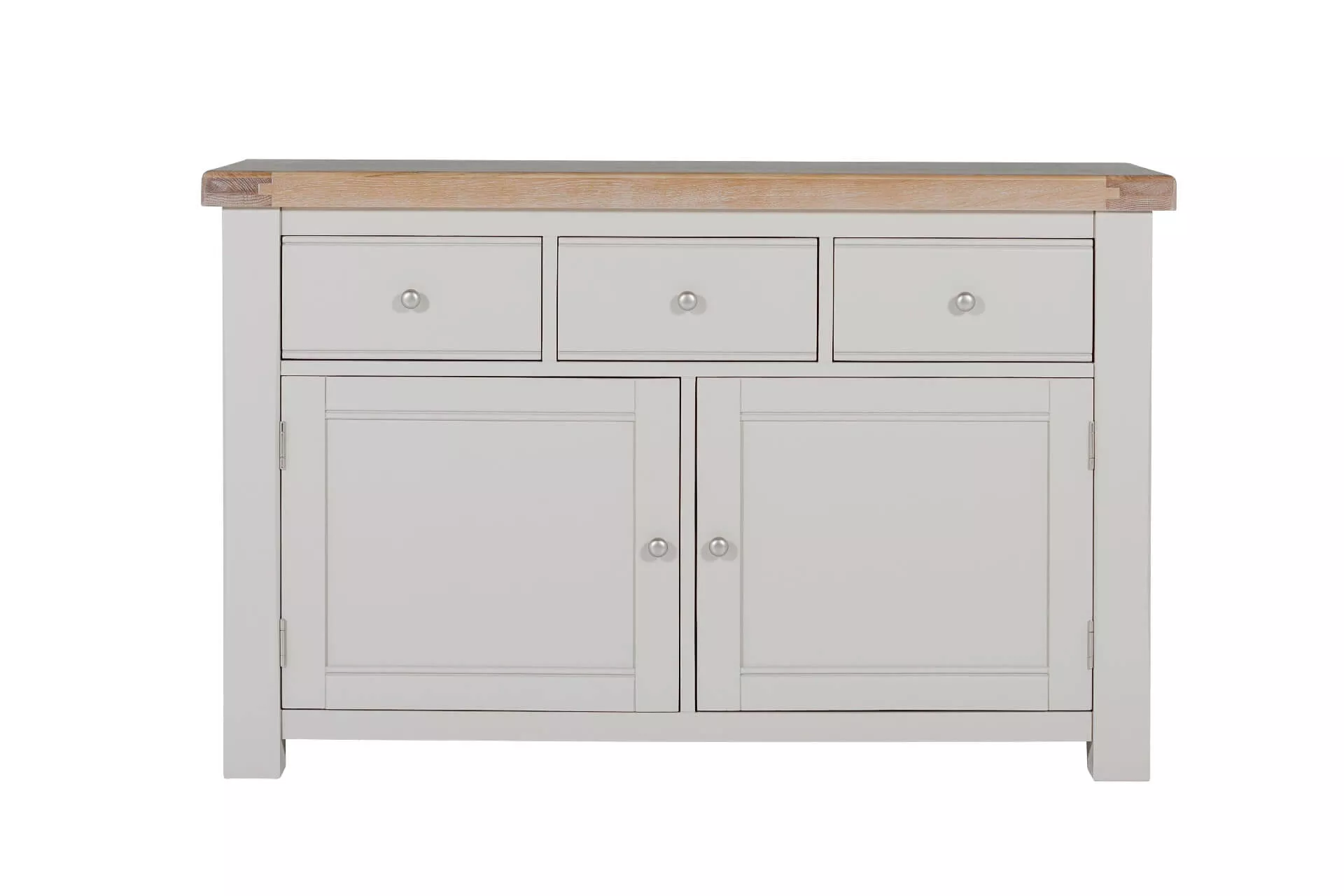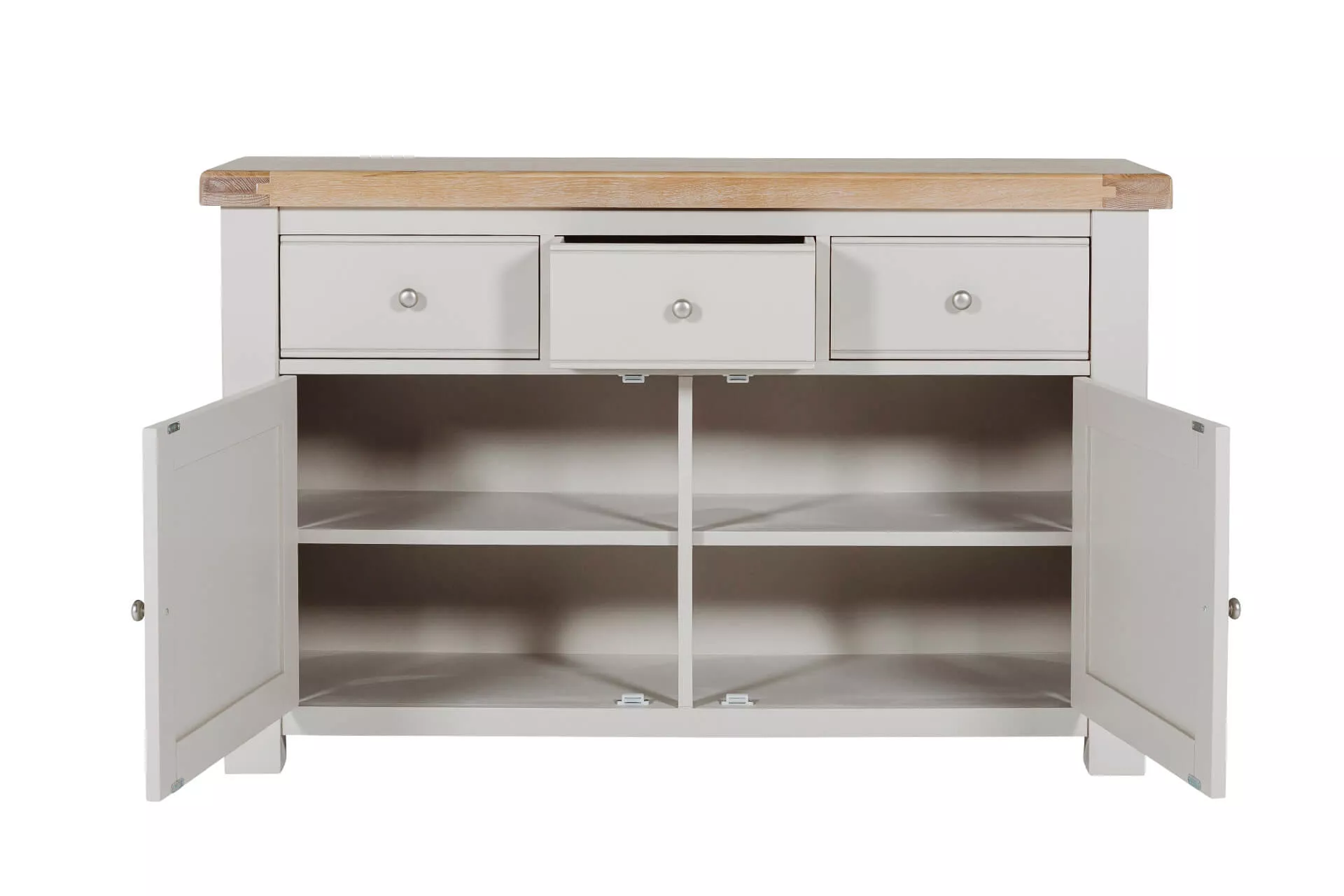 Doune Large Sideboard in Taupe, a versatile addition to any room. This large sideboard features a stylish painted finish with an elegant oak veneer top. It offers practical storage with three drawers and two doors, plus internal shelving for organised space. The sleek metal handles and balanced design make it both functional and fashionable.