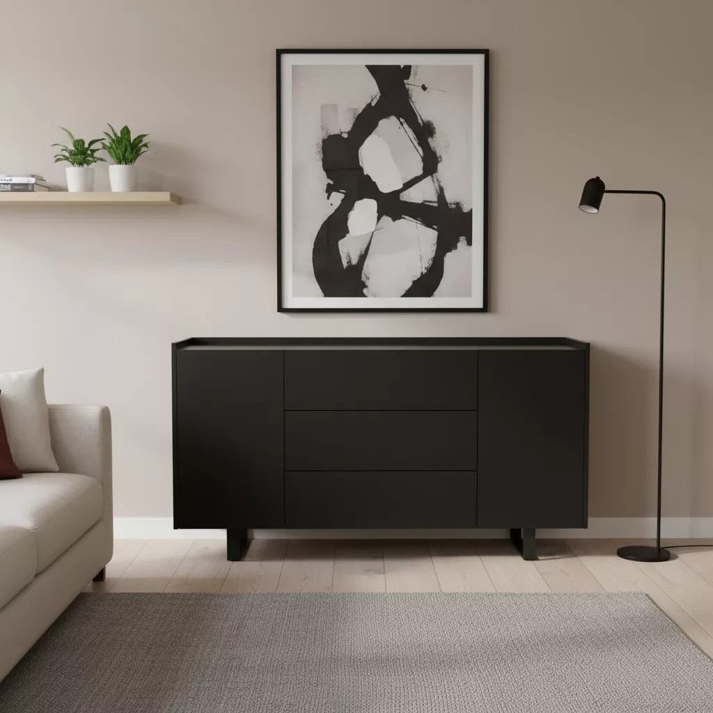 Icarus Sideboard in Black – a sleek and functional storage solution for your home. This sideboard features three drawers and two cabinets with a fixed shelf, offering ample space for organization. The black powder-coated steel frame provides durability and a modern touch, while the sinter stone table and sideboard tops are resistant to heat and cold, waterproof, scratch-resistant, and easy to clean. With antibacterial, stain-proof, and non-porous properties, the Icarus Sideboard combines practicality with sophistication seamlessly.