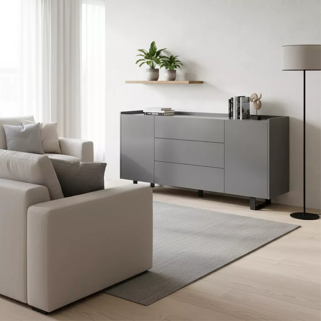 Kore Sideboard in Grey – a pinnacle of modern sophistication for your living space. Featuring a Vida registered design, this sideboard boasts sinter stone table and sideboard tops that are impervious to heat or cold. Waterproof, scratch-resistant, and durable, they ensure longevity while being easy to clean. Additionally, their stain-proof, antibacterial, and non-porous qualities make maintenance a breeze.