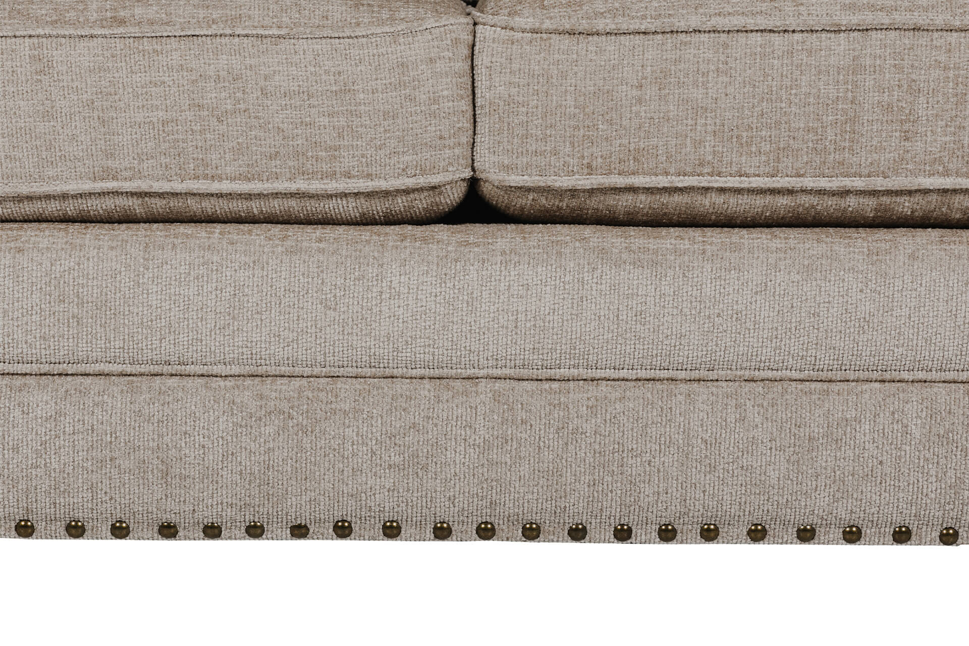 Pippa 2 Seater Sofa in Mink brings a touch of elegance and comfort to any space. Upholstered in a soft textured fabric, it features loose back and seat cushions, flared arms, and subtle stud detailing along the base. Finished with a mix of plain and patterned scatter cushions with flange seams, this sofa is perfect for adding a refined, relaxed feel to your living room.