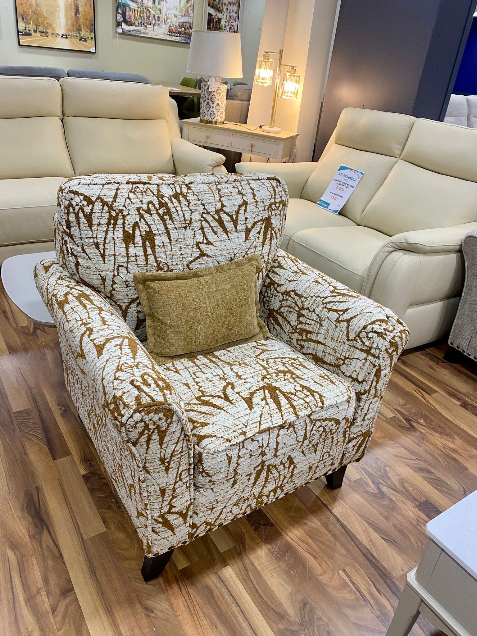 Pippa Accent Chair in Mustard adds a bold, stylish touch to any living space. Featuring loose back and seat cushions, flared arms, and stud detailing along the base, it’s upholstered in a vibrant patterned fabric that makes a statement. Finished with coordinating scatter cushions, this chair perfectly complements the Pippa collection or stands out beautifully on its own.