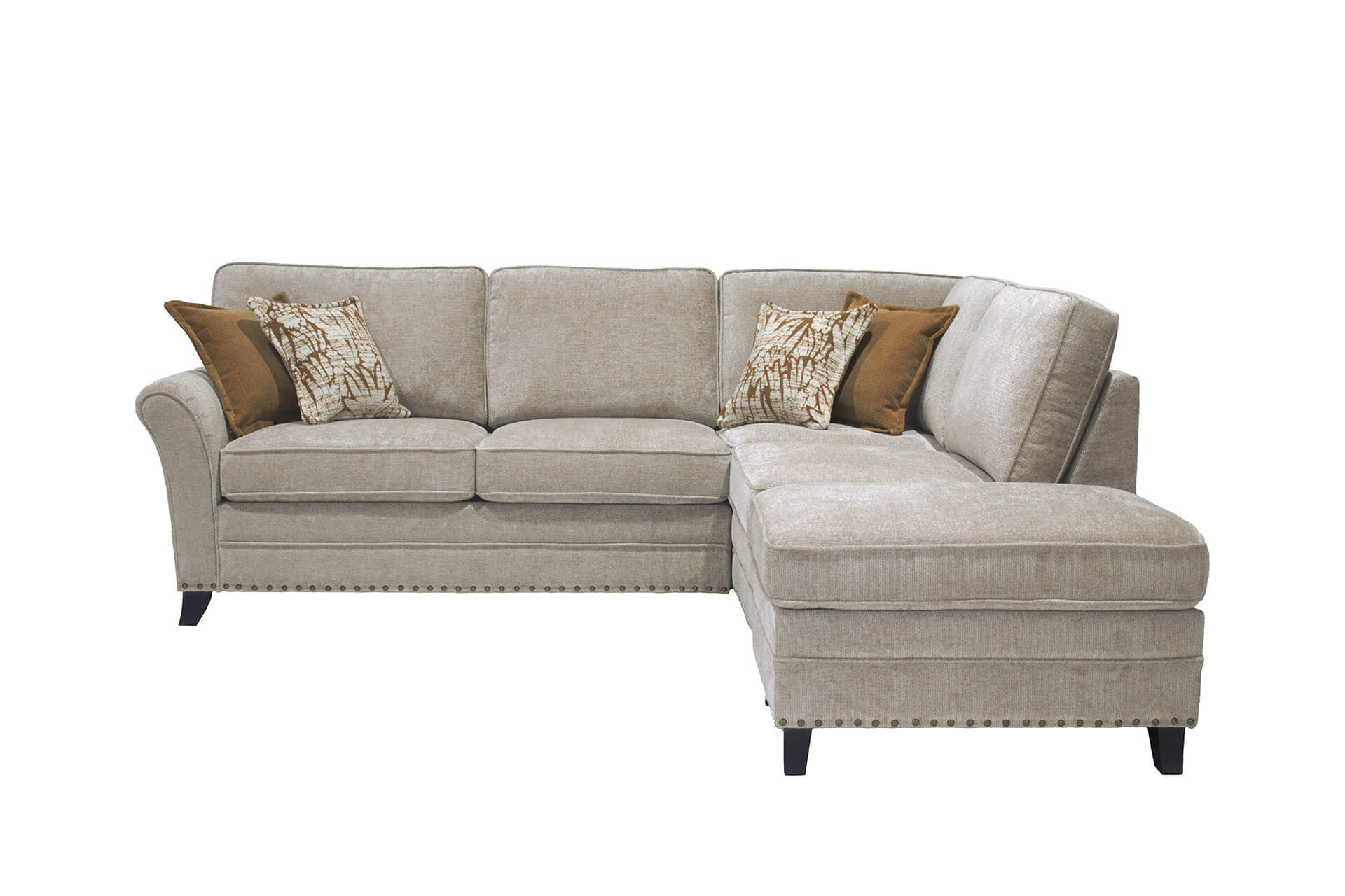 Pippa Corner Group RHF in Mink brings a touch of elegance and comfort to any space. Upholstered in a soft textured fabric, it features loose back and seat cushions, flared arms, and subtle stud detailing along the base. Finished with a mix of plain and patterned scatter cushions with flange seams, this corner group is perfect for adding a refined, relaxed feel to your living room.